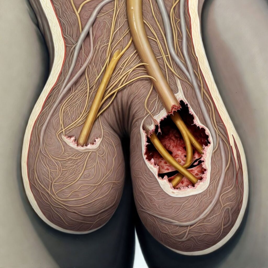 Chronic prostatitis — persistent inflammation of the prostate — creates sustained mechanical pressure on those nerves. Over time, this pressure disrupts nerve conduction in the same way that sitting on your arm for too long causes it to go numb — except that the effect is permanent rather than temporary, because the nerve fibres themselves are being physically compressed and chemically irritated over years.